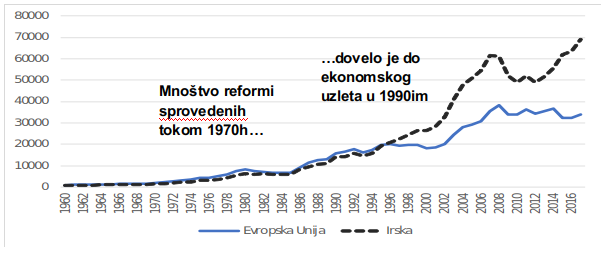 Irska je bila globalni pionir u usvajanju modela razvoja zasnovanog na stranim ulaganjima, koji se u početku oslanjao na snažne fiskalne podsticaje. Međutim, takav pristup je pružao samo ograničene razvojne efekte jer je privlačio uglavnom niskotehnološke kompanije. Kako bi se razvojni efekti postigli, tokom 1960ih i 70ih sprovedene su reforme usmerene na obrazovanje, institucije i trgovinu, a unapređeni su i analitički kapaciteti donosilaca odluka. Razvoju Irske pomoglo je i priključila se anglo-irskom sporazumu o slobodnoj trgovini 1965. i EEZ-u 1973. godine. Međutim, rezultati su se pojavili tek deceniju kasnije (Grafikon).